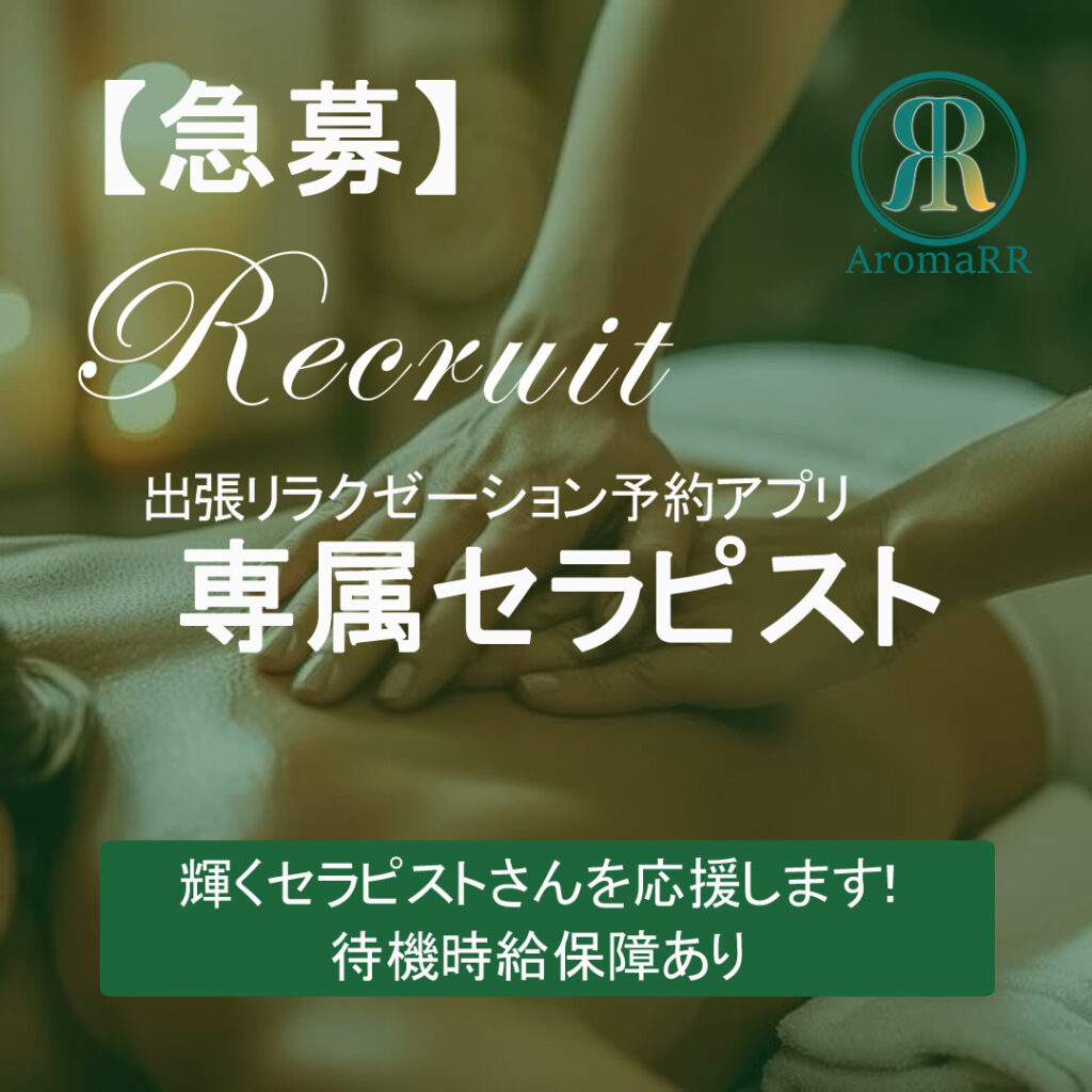 出張リラクゼーション予約アプリにおける専属セラピストの募集です。 待機時給制度があるので安心してお仕事できます。 ✨自分らしく輝ける場所へ✨ 働きやすさx自由x高収入を目指せる、出張リラクゼーション予約アプリ 経験者はもちろん、ブランクのある方も大歓迎です。 AromaRRは輝くセラピストさんを応援します! セラピス… -