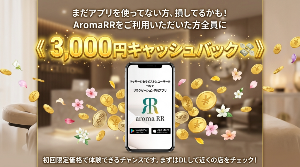 まだアプリを使ってない方、損してるかも!AromaRR を ご利用いただいた方全員に☺️《3,000円キャッシュバック💸》 初回限定価格で体験できるチャンスです。 まずはDLして近くの店をチェック! ユーザー登録はこちらから → http://lit...
